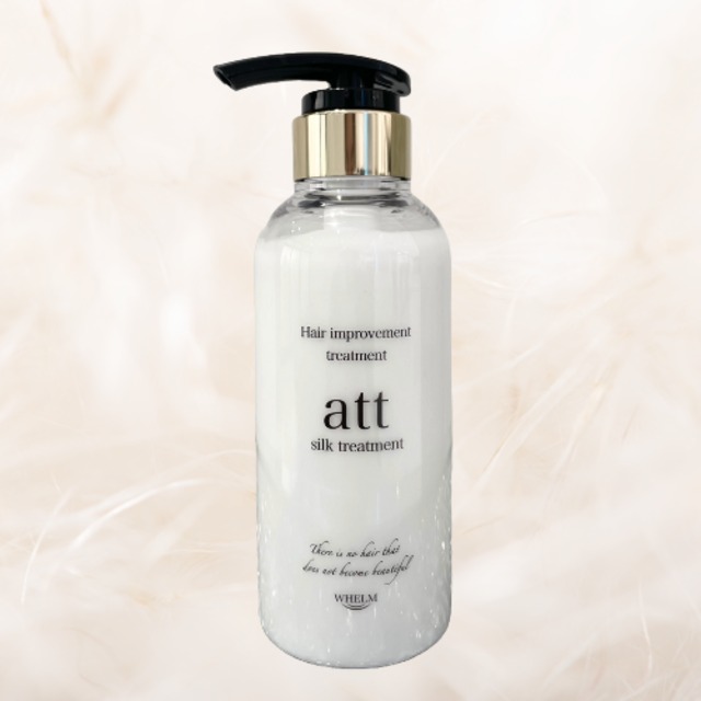 髪のパサツキや乾燥が気になる方へ。 サラサラなのにしっとりまとまる美髪トリートメント。 髮質改善成分高配合◎ 皮膜(シリコーン)に頼らない重くなりにくい サラプル質感 付けた瞬間から染み込んで浸透する為 時間置かずにクシ等やブラシ等でとかすだけで浸透します。 毛髪内部の水分量を増やし 補修+毛髪強化により傷みにくい髪質になります。 枝毛、絡まり、摩擦、熱ダメージ抑制効果◎ 縮毛矯正毛との相性抜群◎ 【特徴】 ミルスタイル配合により熱ダメージから毛髪を強力に保護、キューティクルのリフト抑制、退色防止。 毛髪強化する反面、ハリコシが軋みに感じやすくなる為、γ-ドコサラクトン、ヒドロキシウレア、加水分解シルク、加水分解ケラチン、油溶性ケラチン、マレイン酸、レブリン酸、トステア、セラミド5種類、その他様々な髪質改善成分をバランスよく配合する事で、メリットはそのままに軋みの無いツルツルの手触りの良い感触に仕上がります。 毛髪に対しても保湿だけでなく、ダメージを受けた髪を補修し、ブラッシング等の外的刺激から髪を守ります。水洗い後も容易に除去されず効果を発揮します。 ドライヤーの熱で毛髪表面にナノスケールのラメラ層を形成し、水分・油分の保持性が高まり毛髪の乾燥を防ぎます。 艶感、柔らかさ、耐熱性、内部補修、キューティクル補修、架橋力があり枝毛切れ毛防止の毛髪強化も。 髪内部の水分量を増やし乾燥毛への保湿、ダメージ毛への摩擦軽減で引っかかり改善されます。 うねりや広がりをまとまりよくし、ハリコシがない等を改善し持続性がキープします。 【使用方法】 【サラサラ軽め質感】 シャンプー後、洗い流してattシルクトリートメント塗布後、毛先から優しくクシやブラシ等でとかして、しっかり洗い流してください。 【サラサラしっとり質感】 attシルクシャンプーでシャンプー後、洗い流さず泡ついたまま毛先から優しくクシやブラシ等でとかしてください。 そのままattシルクトリートメントを重ねて塗布後、毛先から優しくクシやブラシ等でとかして、しっかり洗い流してください。 【プルプル質感】 attシルクトリートメントにattシルクデザインオイルを1プッシュ手のひらで混ぜてから塗布後、毛先から優しくクシやブラシ等でとかして、しっかり洗い流してください。 【使用目安量】 ショート・ボブ1プッシュ ミディアム(鎖骨)1〜2プッシュ セミロング・ロング2〜3プッシュ ※毛量や状態によって適正量は変動します 付けた瞬間から染み込んで浸透する為、トリートメントが無くなったように感じますが、そのような処方なので、塗布後毛先から優しくクシやブラシ等でとかすだけで、追加で更に足さないで大丈夫です。
